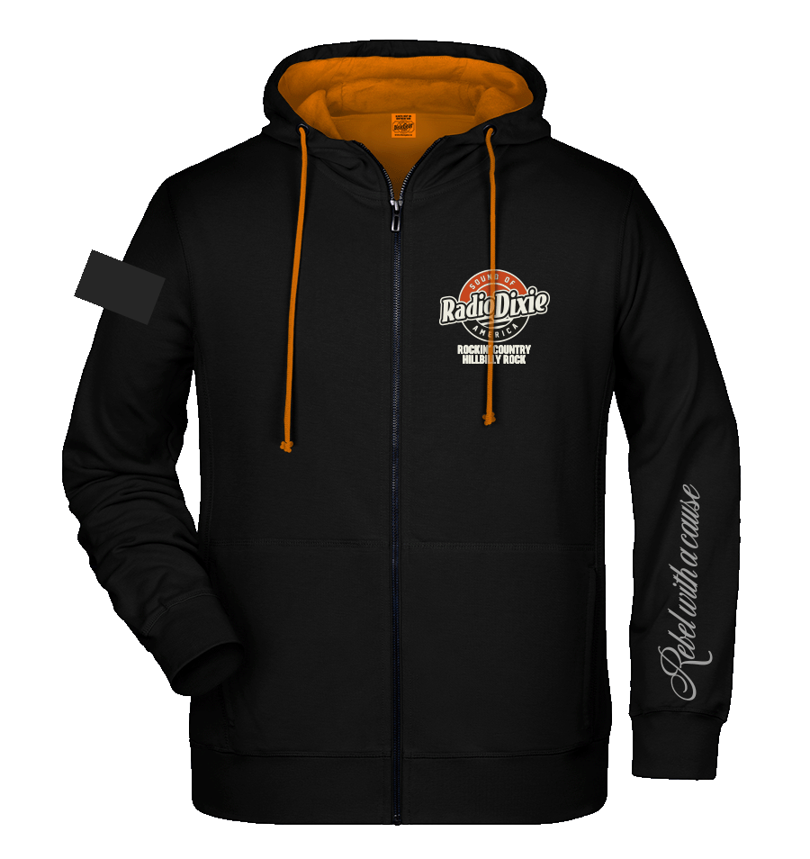 Materiál: 340g/m², 80% bavlna, 20% polyester. Boční švy v přední části, dvouvrstvá kapuce se stahovací šňůrkou, manžety s elastanem, klokaní kapsa, YKK zip. Velký motiv na zádech sítotisk, malý motiv na prsou výšivka, na kapuci a na levém rukávu sítotransferový potisk, na pravém rukávu suchý zip Velcro 80x55mm, originální autorská grafika. Barva mikiny deep black, vnitřek kapuce a šňůrky orange.